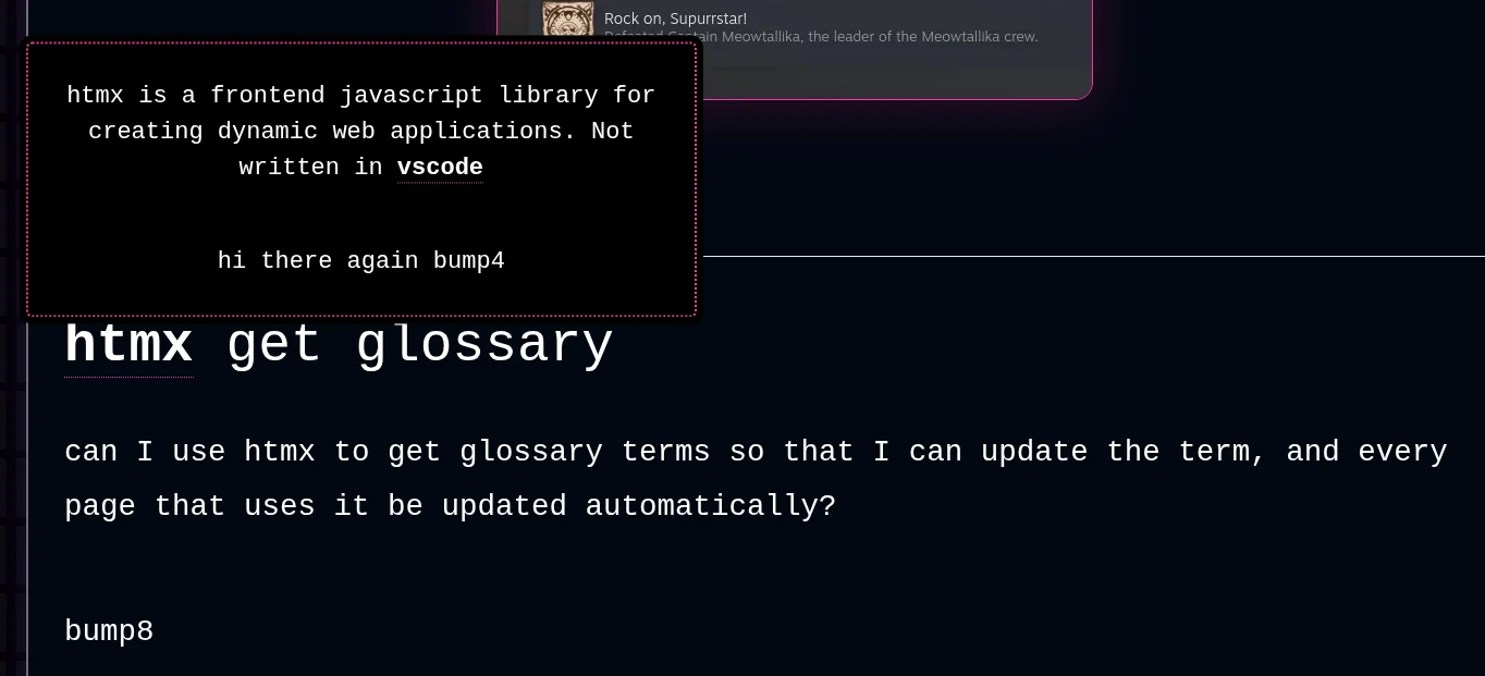 Worked on my glossary ui and how it works with markata. I think I finally got something that autodetects glossary terms and swaps them with a hoverable element that displays the definition. getting the definition to remain on the screen at all times and not fall of when the term is on one side of the page or another was quite tricky.