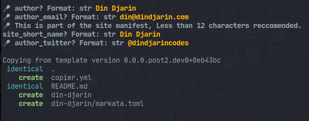 ❯ tree . . ├── copier.yml ├── README.md └── {{ site_name|slugify }} └── markata.toml.jinja 1 directory, 3 files