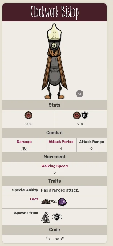 Here is the clockwork bishop stats from the wiki