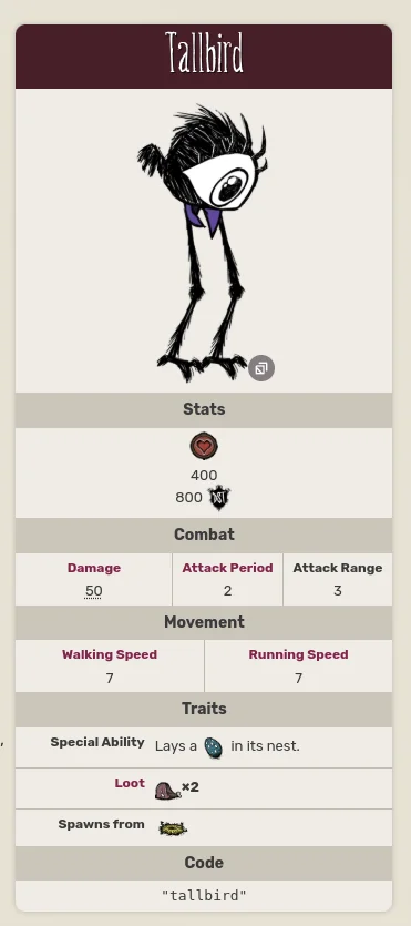 Here are the tall bird stats from the wiki