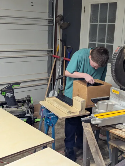 Last night we cleaned up the garage workbench and started painting some set signs that are the size of a full size bed, nearly 4'x8'. Wyatt started painting his fingerboard park set black, he is going for a black and white set.