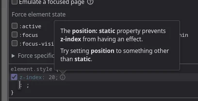 Manually setting z-index to 20 in the inspector I noticed this message from devtools, "The position: static property prevents z-index from having an effect. Try setting position to something other than static.", looking back at some of my refactoring I had relative in an old template and it was lost.