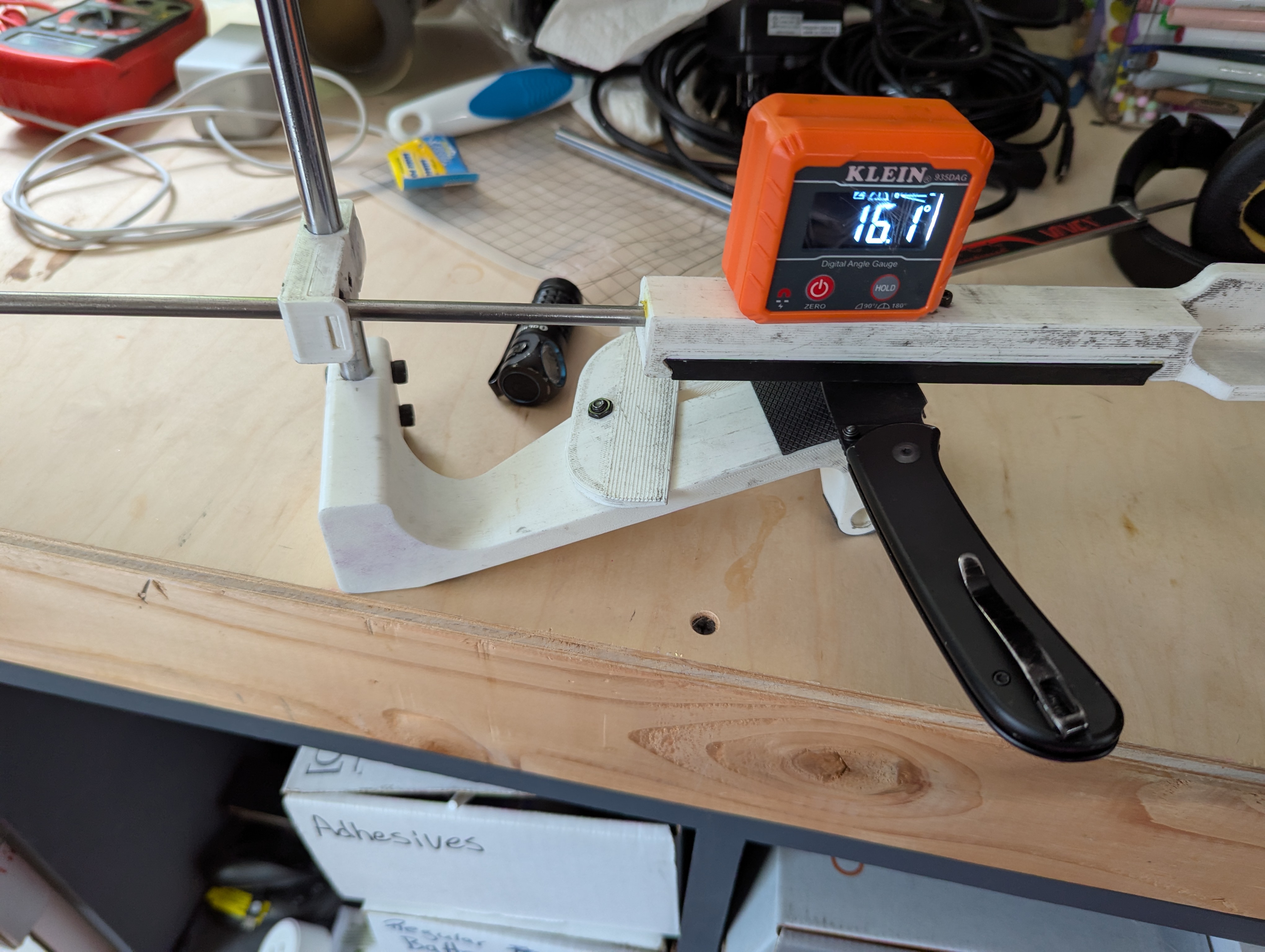 I've used this knife sharpener that I printed for a few years now. I thought that it was based on the Russian designed TSPROF, but in looking through the history it looks very similar to the USA Edge Pro Inc Apex designs that goes back to the 1990's. The angle isn't quite holding like it used to. I've got a lot of ideas for my own model, but for now I'm going to print some spacers to help get repeatable angles.