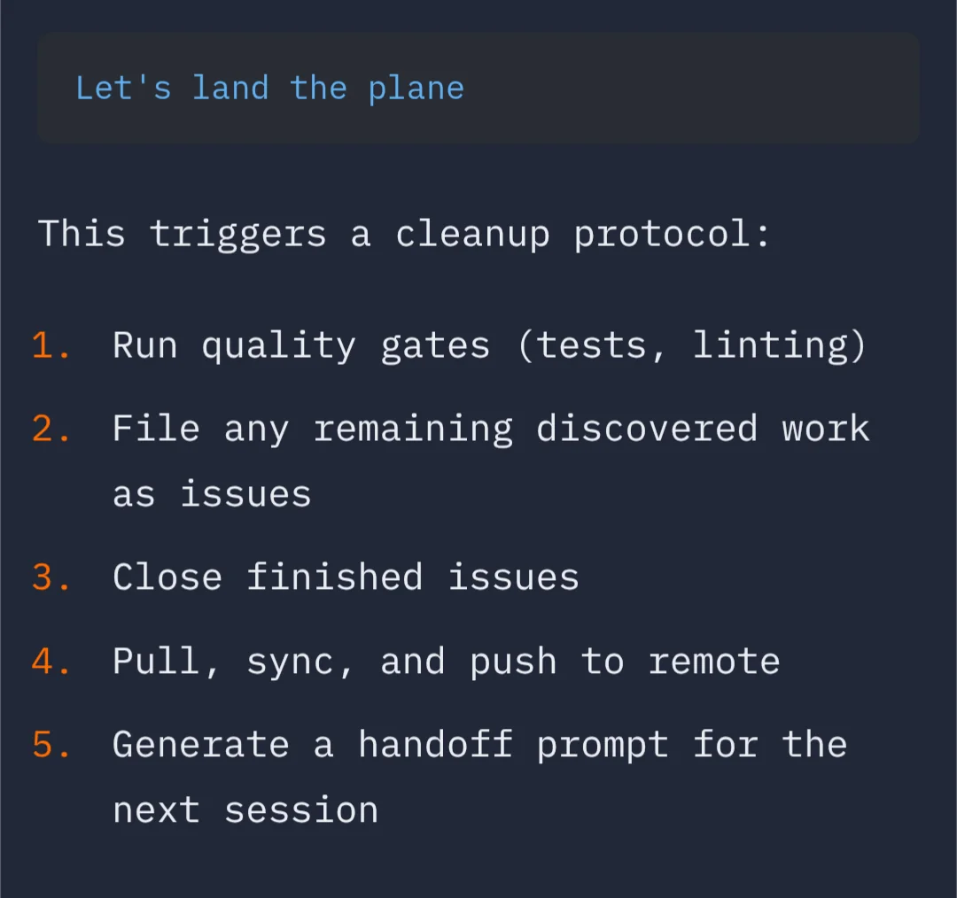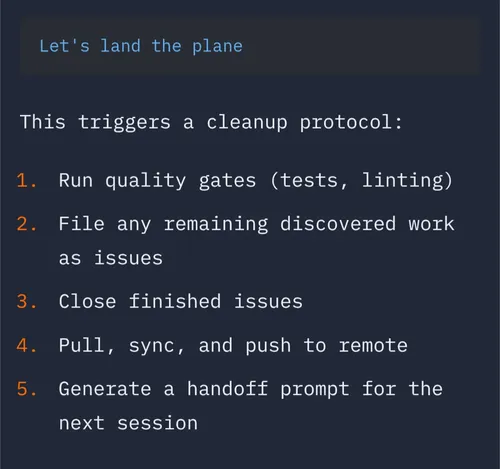 Part of @steveyegge 's gastown/beads is a prompt "Lets land the plane". It's very straightforward forward and what any sane human would probably do before finishing work, except the last part. The "generate a handoff prompt for the next session" was not something I've put much thought into. But now that I juggle 6 sessions at a time and often end up with 20 sessions open because I don't want to close them and loose the last bit of context. This is what I need to keep from crippling my laptop memory from all of these stale sessions hanging around.