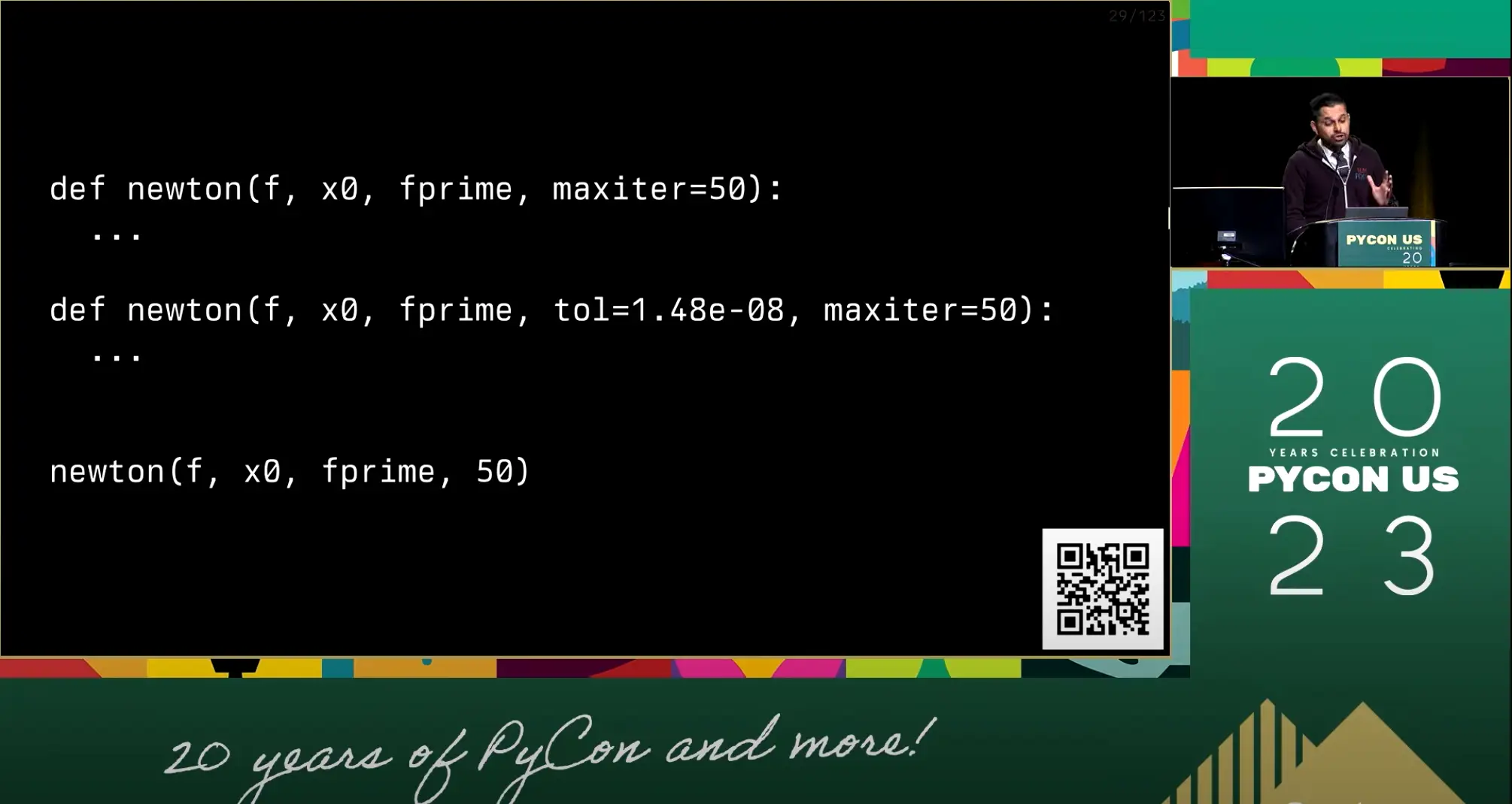 # Version 1 def newton(f, x0, fprime, *, maxiter=100): ... # Version 2 def newton(f, x0, fprime, *, tol=1e-6, maxiter=100): ... # 🟢 user forced to use keyword only arguments never notices change newton(f, x0, fprime, maxiter=100)