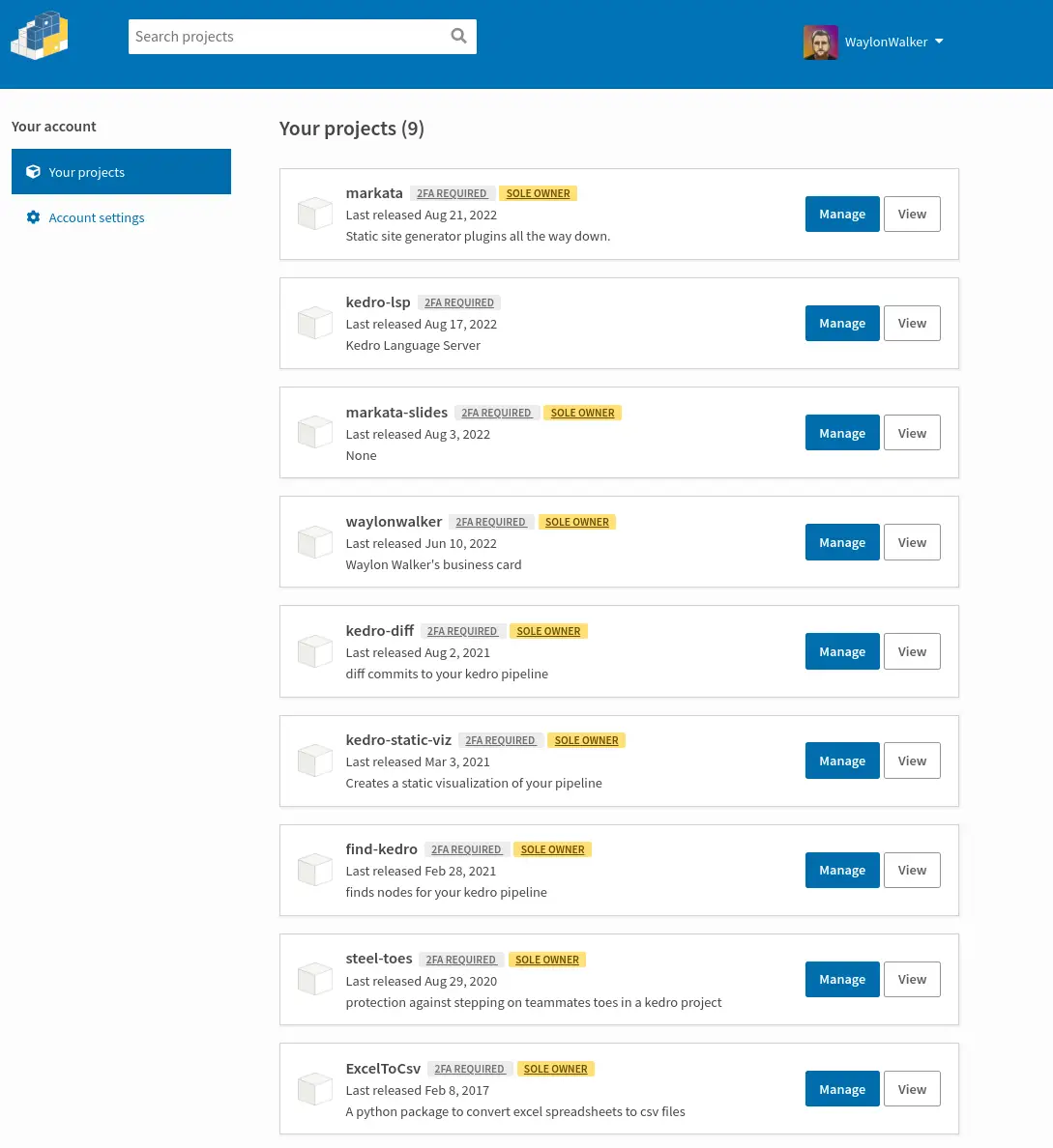 You might wonder what this means for my projects. It means that to edit any sensitive content such as pull a new api token, add/remove maintainers, or deleting a release I need to use a TOPT (time based one time password) application such as Google Authenticator, Microsoft Authenticator, Authy, or FreeOTP.