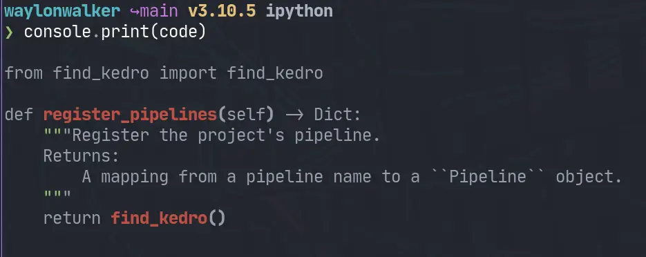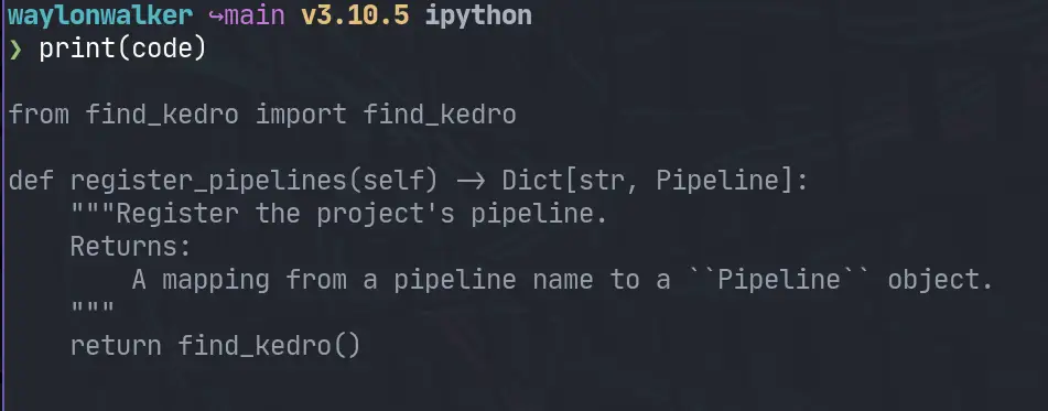 code = ''' from find_kedro import find_kedro def register_pipelines(self) -> Dict[str, Pipeline]: """Register the project's pipeline. Returns: A mapping from a pipeline name to a ``Pipeline`` object. """ return find_kedro() '''