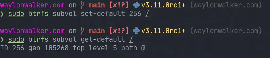 sudo btrfs subvol set-default 256 / sudo btrfs subvol get-default / ## ID 256 gen 105268 top level 5 path @
