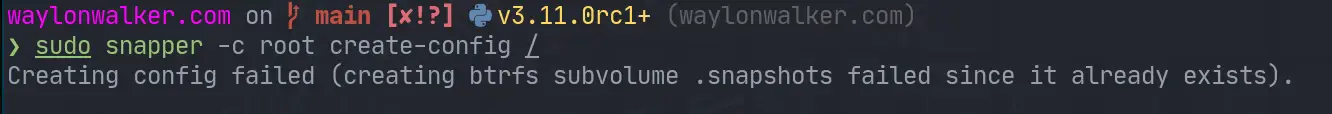 Creating config failed (creating btrfs subvolume .snapshots failed since it already exists).