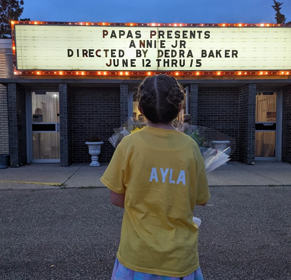 Ayla Looking at the Annie Jr Marquee