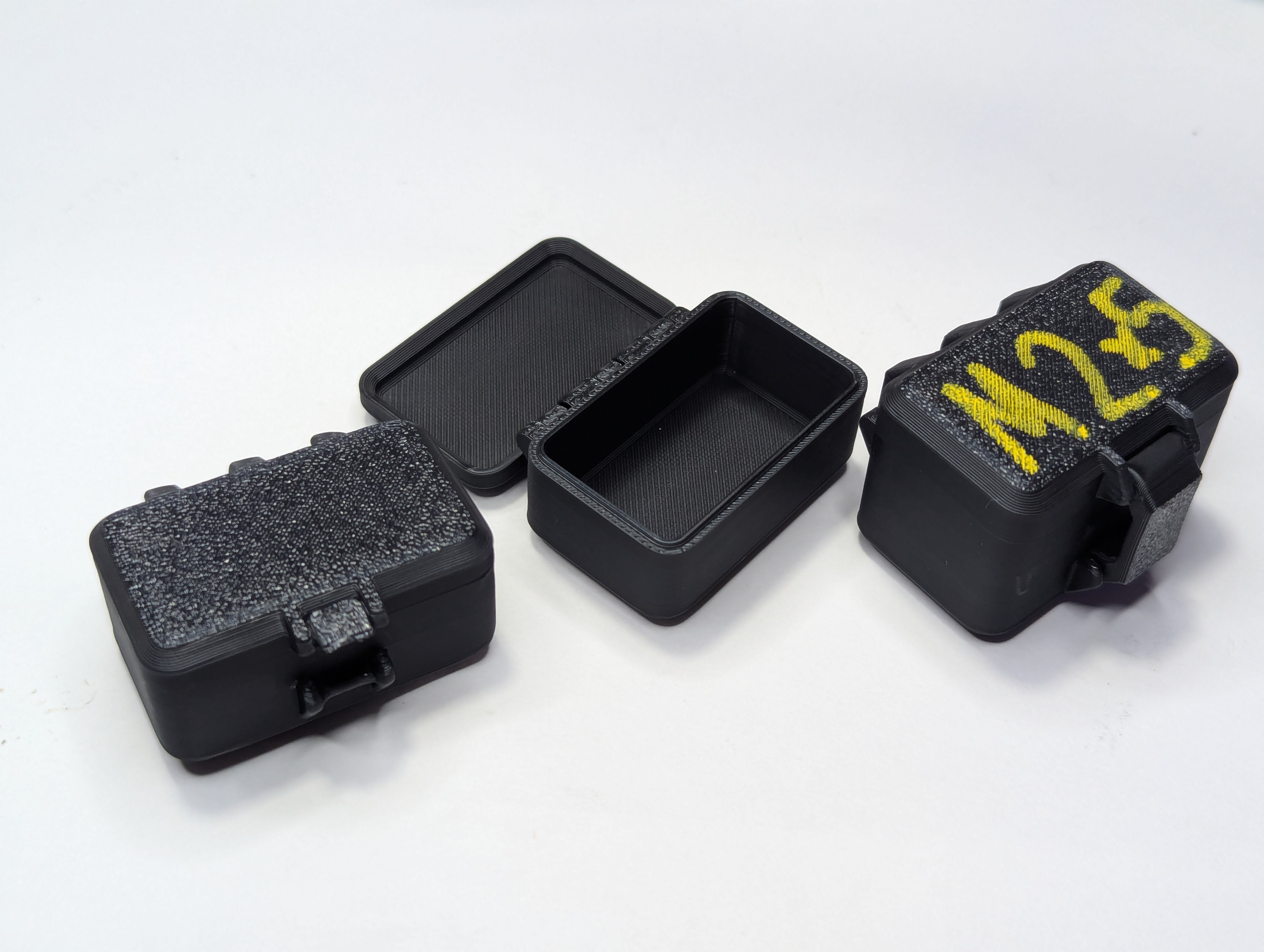 Four little 3d printed boxes laying on a white background, one contains a painted lid that says M 2x5.