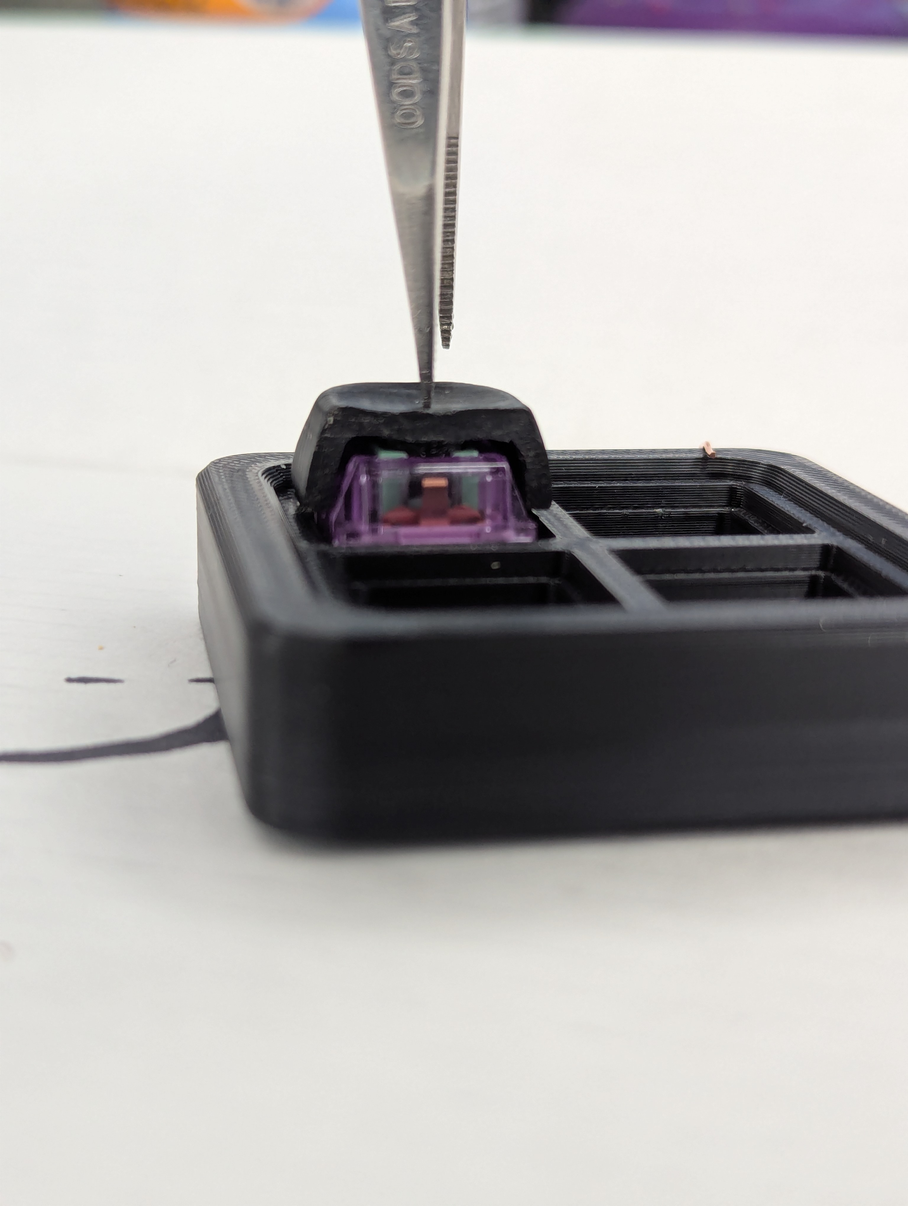 A cut away keycap on a Durock lupine switched pressed all the way to bottom out.
