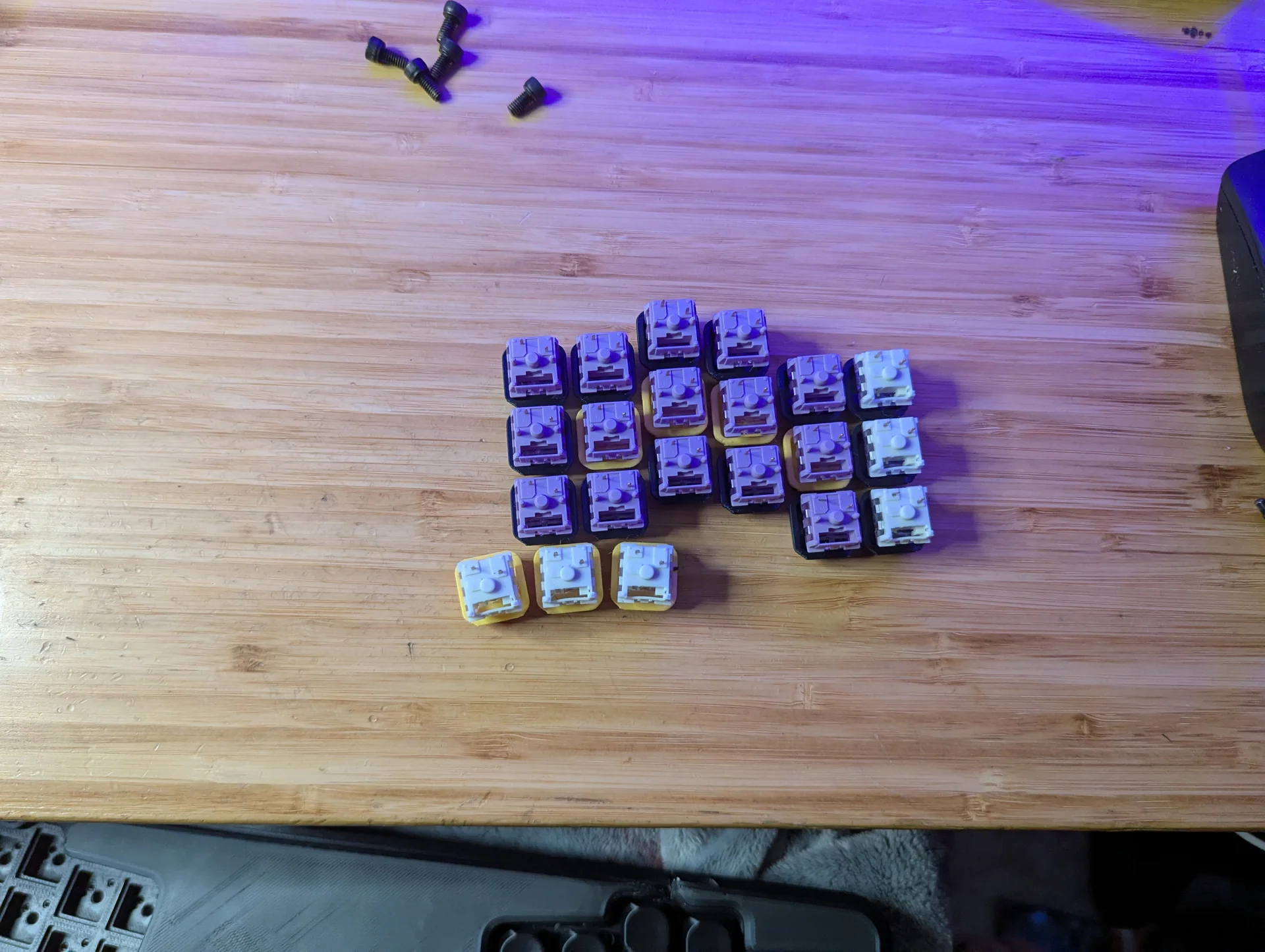 A collection of custom mechanical keyboard keycaps, including several sets of purple, white, and other colored keycaps, are arranged on a wooden desk surface.