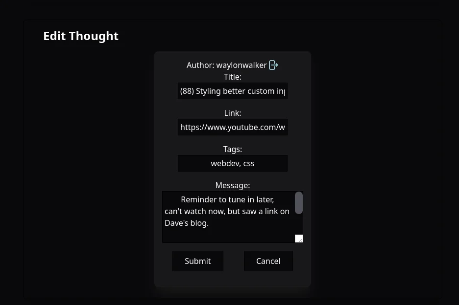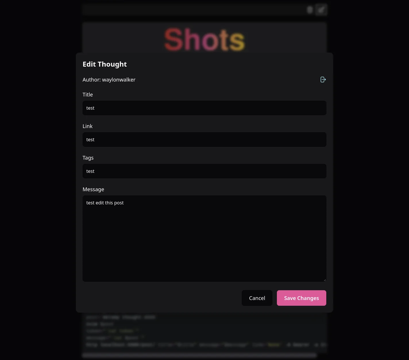 This is such an improvement to the backend of my website it warrants a blog post of celebration. For far too long I've been dealing with a tiny ass edit form on thoughts. I tend to not edit them, and try to get them right in one go. This is kinda the point of a thought, its a quick post meant to be the size of a tweet, but sometimes I'm leaving thoughts on a video or long post and want to make sure I have a good save point, but I just keep the thing in draft and hope I don't loose if for far too long.