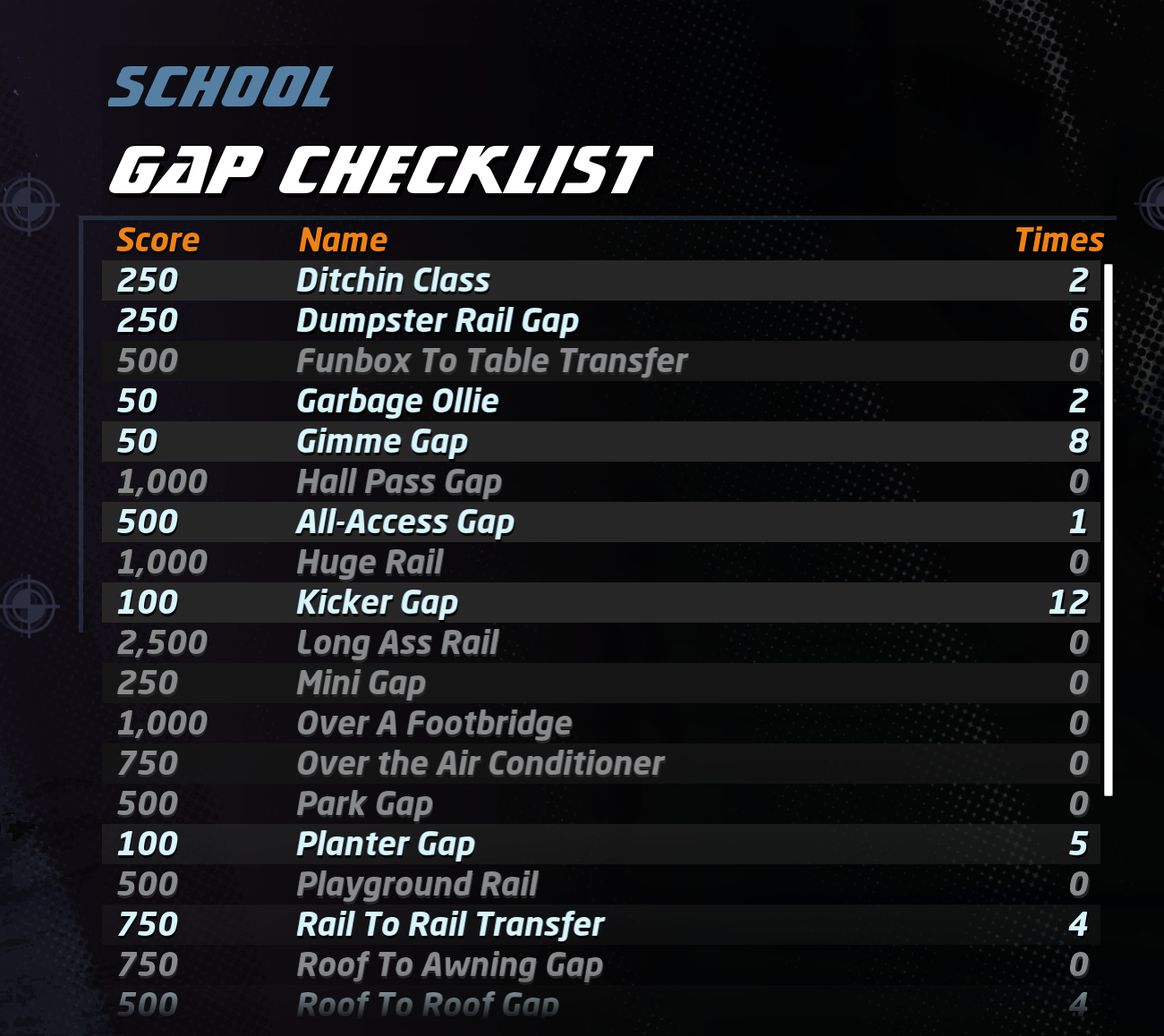 On the road to Gap Master achievement I got all School Gaps in THPS1. This is a super fun level, I'll have to admit that I had to look up at least a quarter of them, and could not find them myself, mostly due to the naming, all of the rail tricks were actually ledges and I was looking for big rails. None of the warehouse gaps were manuals so I had no idea that the downhill and accross the gym would be manual tricks.