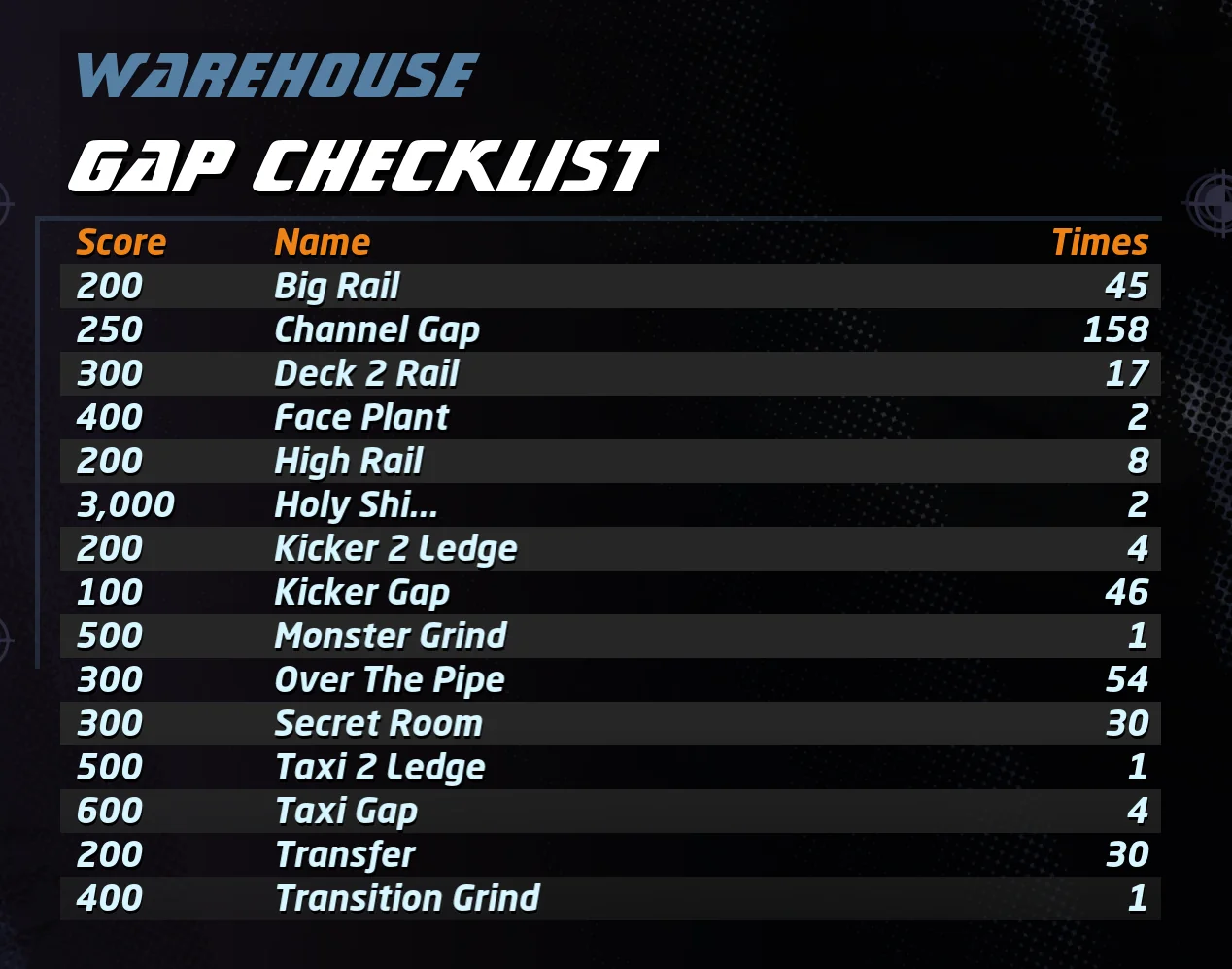 On the road to Gap Master achievement I got all Warehouse Gaps in THPS1. This is this classic warehouse level that everyone thinks of when THPS is mentioned. Such a good level, compact, easy to play, with some fun gaps that might take a few tries to hit.